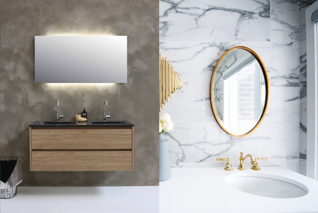 Choosing marbles or concrete for your walls can seriously enhance the bathroom space. It is hard to go wrong with white and grey marbles for the sidewalls and maybe even for your sink and shower area as well. The marble look is just absolutely stunning and timeless. On the other hand, covering the same areas with concrete including the sink basin and countertops, and pairing it with metal elements around will certainly make your bathroom stand out.